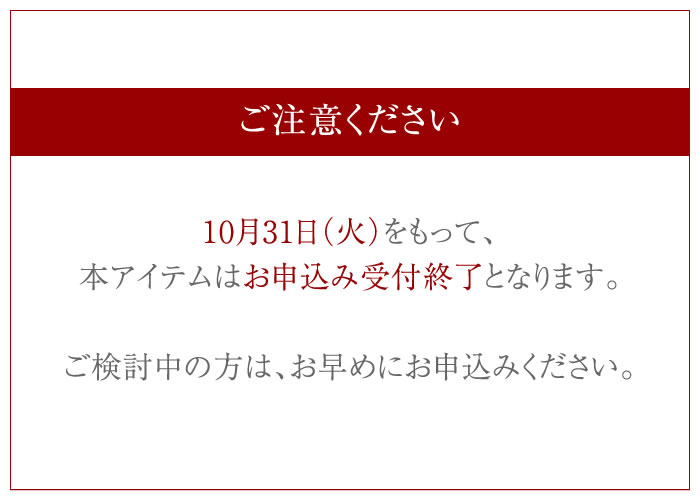 ◆本品は10月31日(火)をもってお申込み受付終了となります。ご検討中の方は、お早めにお申込みください。◆
